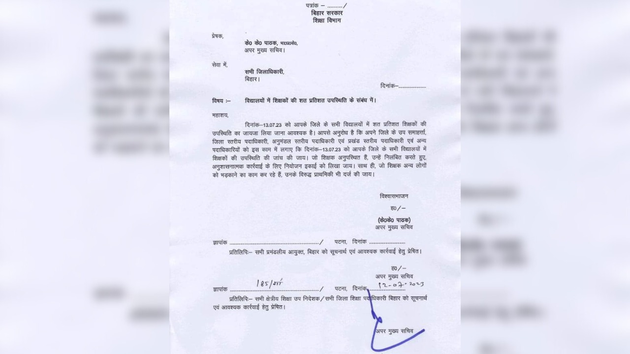 इस पत्र में कहा गया कि आप से अनुरोध है कि अपने जिले के उप समाहर्ता, जिला स्तरीय पदाधिकारी, अनुमंडल स्तरीय पदाधिकारी एवं प्रखंड स्तरीय पदाधिकारी एवं अन्य पदाधिकारियों को इस काम में लगाएं. 13 जुलाई को आपके जिले के सभी विद्यालयों में शिक्षकों की उपस्थिति की जांच की जाए. बता दे की पत्र में यह भी स्पष्ट किया गया है कि जो शिक्षक अनुपस्थित हैं, उन्हें निलंबित करते हुए अनुशासनात्मक कार्रवाई के लिए नियोजन इकाई को लिखा जाए.  साथ ही जो शिक्षक अन्य लोगों को भड़काने का काम कर रहे हैं, उनके विरुद्ध प्राथमिकी भी दर्ज की जाए.