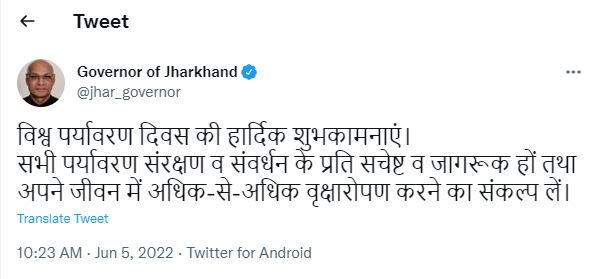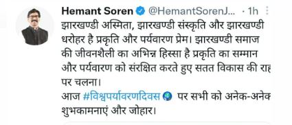 वहीं झारखंड के मुख्यमंत्री हेमंत सोरेन ने भी ने सभी को पर्यावरण दिवस की अनेकानेक शुभकामनाएं दी हैं. उन्होंने ट्वीट कर प्रकृति को झारखंड का का अभिन्न हिस्सा बताया है. उन्हेंने लिखा “झारखण्डी अस्मिता, झारखण्डी संस्कृति और झारखण्डी धरोहर है प्रकृति और पर्यावरण प्रेम। झारखण्डी समाज की जीवनशैली का अभिन्न हिस्सा है प्रकृति का सम्मान और पर्यावरण को संरक्षित करते हुए सतत विकास की राह पर चलना”.
