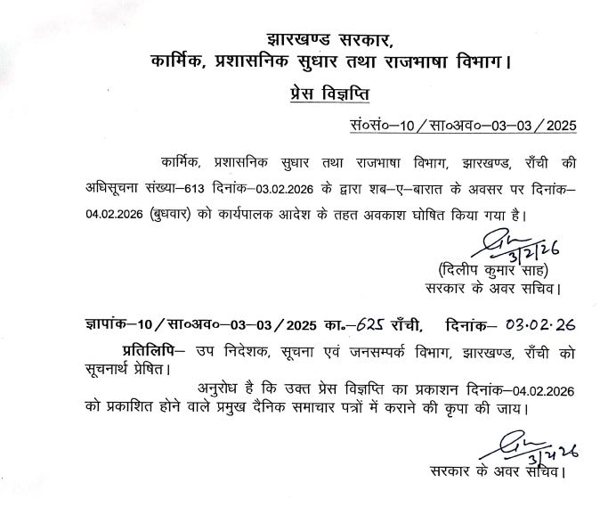 रांची(RANCHI): झारखंड सरकार ने शब ए बारात पर राज्य के सभी सरकारी कार्यालय बंद रखने का आदेश जारी किया है. कार्मिक प्रशासनिक सुधार तथा राज्यभाषा विभाग ने अधिसूचना जारी दी है. जिसमें 4 फरवरी को छुट्टी का ऐलान किया है. बता दे कि अधिसूचना जारी होने पर लोगों ने खुशी जाहीर की है.