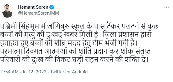 इस घटना पर सीएम हेमंत सोरेन ने दुख व्यक्त किया है. उन्होंने ट्वीट कर कहा कि ‘पश्चिमी सिंहभूम में जांगिबुरु स्कूल के पास टैंकर पलटने से कुछ बच्चों की मृत्यु की दुःखद खबर मिली है. जिला प्रशासन द्वारा हताहत हुए बच्चों की शीघ्र मदद हेतु टीम भेजी गयी है. परमात्मा दिवंगत आत्माओं को शांति प्रदान कर शोक संतप्त परिवारों को दुःख की विकट घड़ी सहन करने की शक्ति दे.
