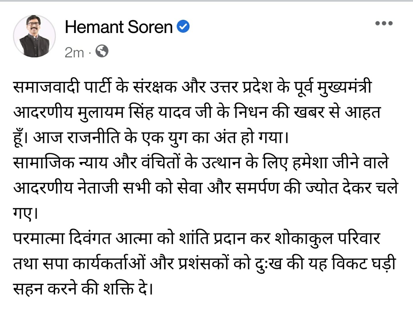 रांची: मुलायम सिंह के निधन पर राजनीतिक गलियारों में शोक, मुख्यमंत्री हेमंत सोरेन और मंत्री बन्ना गुप्ता ने दिया श्रद्धांजलि