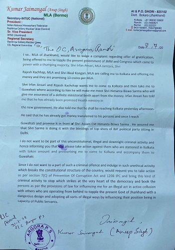 अनूप सिंह ने आगे कहा कि तीनों विधायक मुझे कोलकाता बुला रहे थे और असम के मुख्यमंत्री से मिलने की बात कर रहे थे. उन्होंने कहा कि मुझे जेएमएम और कांग्रेस की सरकार गिरानी थी. जिसके लिए मुझे प्रत्येक विधायक 10 करोड़ रुपये मिल रहे थे. मुझे इस असंवैधानिक और पार्टी विरोधी काम में शामिल होना था इसलिए मैंने एफआईआर दर्ज कराया.