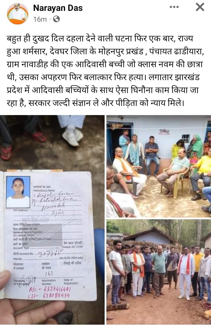 मोहनपुर क्षेत्र देवघर विधानसभा में आता है. यहाँ के विधायक नारायण दास भाजपा के है. इन्होंने आदिवासी बच्ची के साथ हुए इस घटना पर दुःख प्रकट करते हुए सरकार से जल्द पीड़ित परिवार को न्याय की मांग की है. इन्होंने सोशल मीडिया प्लेटफॉर्म के माध्यम से अपने फेसबुक एकाउंट में इस घटना के बारे में जानकारी देते हुए लिखा है कि इस आदिवासी बच्ची के साथ अपहरण कर उसके साथ दुष्कर्म की घटना को अंजाम देने के बाद उसकी हत्या की गई है।पूरे प्रकरण की उच्च स्तरीय जांच की मांग की है. दूसरी ओर पुलिस पोस्टमॉर्टम रिपोर्ट का इंतज़ार कर रही है।अगर रिपोर्ट में कुछ आता है तो फिर पुलिस की कार्यवाई देखने वाली बात होगी।बहरहाल दुष्कर्म की आशंका पोस्टमार्टम रिपोर्ट आने के बाद ही स्पष्ट हो पाएगी।काजल का शव मिलने से गांव में सनसनी फैल गई है.