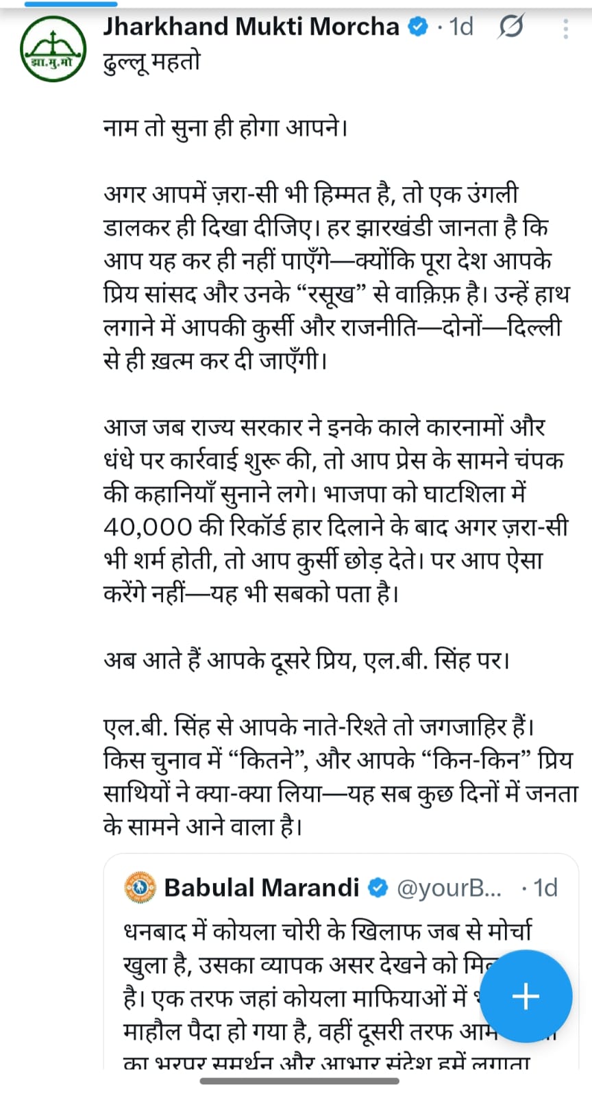 इधर , झामुमो ने अपने सोशल मीडिया एक्स पर भाजपा के प्रदेश अध्यक्ष बाबूलाल मरांडी पर तेज हमला बोला है. झामुमो ने सोशल मीडिया पर पोस्ट कर बाबूलाल मरांडी को चुनौती दी है. झारखंड मुक्ति मोर्चा ने पोस्ट किया है कि -ढुल्लू महतो का नाम तो सुना ही होगा आपने. अगर आप में जरा सी भी हिम्मत है, तो एक उंगली डालकर ही दिखा दीजिये. हर झारखंडी जानता है कि आप यह कर ही नहीं पाएंगे, क्योंकि पूरा देश आपके प्रिय सांसद और उनके "रसूख" से वाकिफ है. उन्हें हाथ लगाने में आपकी कुर्सी और राजनीति दोनों दिल्ली से ही खत्म कर दी जाएगी.