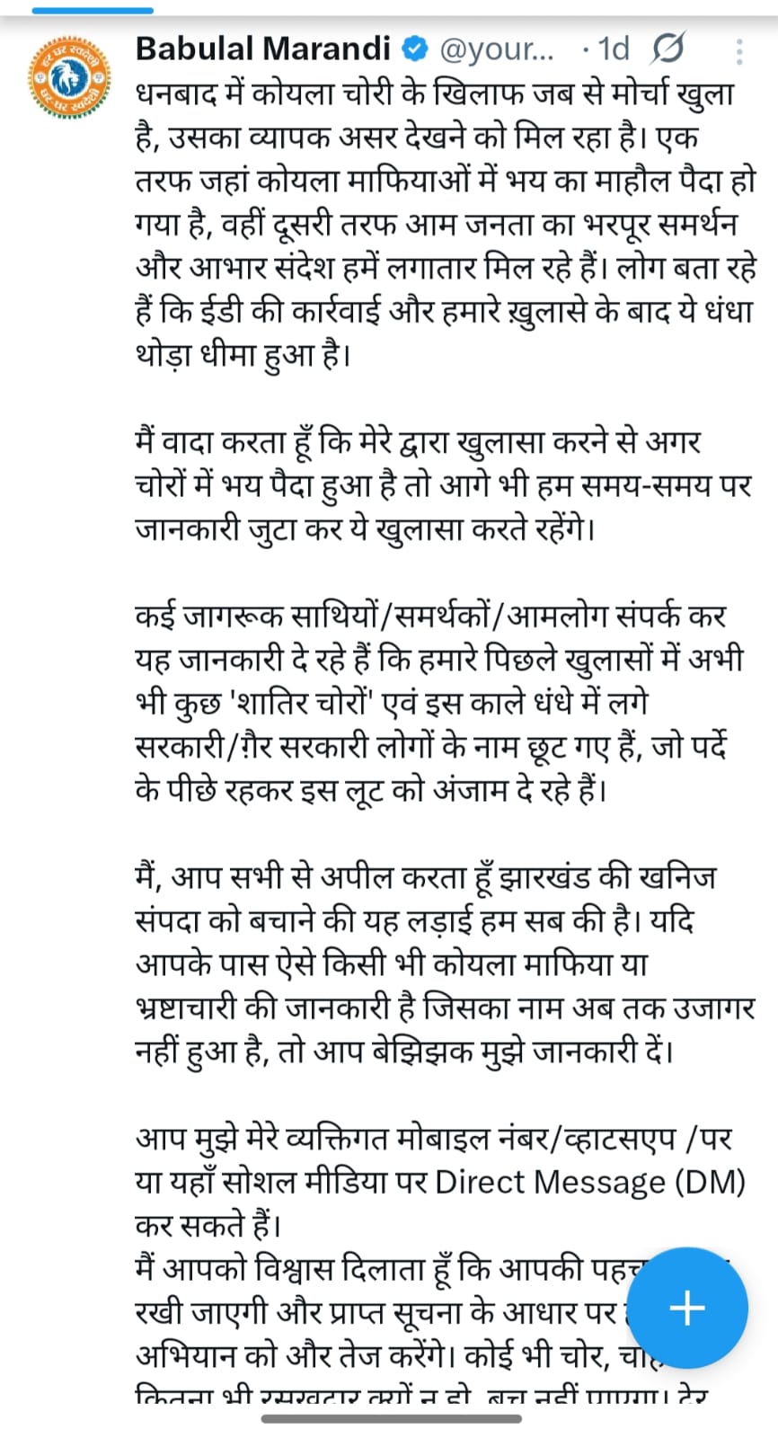 मैं आप सभी से अपील करता हूं कि झारखंड की खनिज संपदा को बचाने की लड़ाई हम सब की है. यदि आपके पास ऐसे किसी भी कोयला माफिया की जानकारी हो ,तो आप मेरे मोबाइल या व्हाट्सएप पर भेज सकते है. आपका नाम गुप्त रखा जाएगा. बता दे कि अभी हाल ही में प्रवर्तन निदेशालय ने झारखंड और बंगाल के 40 जगह पर छापेमारी की थी. छापेमारी में नगदी और जेवरात बरामद किए गए थे. हार्ड कोक भट्ठे की जांच में स्टॉक से अधिक कोयला पाया गया था. इसके बाद बाबूलाल मरांडी ने प्रेस कॉन्फ्रेंस कर धनबाद के कई कोयला चोरी के स्पॉट का खुलासा किया था. धंधे में शामिल कई लोगों के नाम का भी जिक्र किया था.