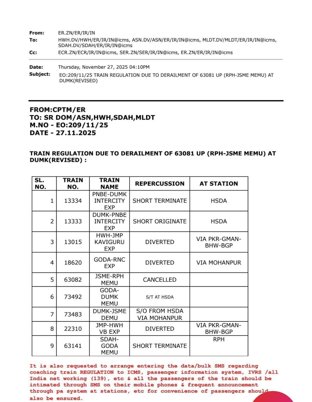 ट्रेन दुर्घटना के बाद इन ट्रेनों के रूट में किया गया बदलाव