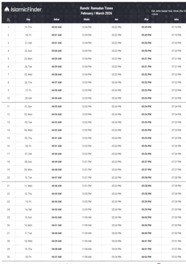 रांची(RANCHI):भारत में बुधवार को रमजान का चाँद दिख गया.जिसके बाद अब गुरुवार से रोजे की शुरआत हो जाएगी. 19 फ़रवरी को पहला रोजा रखा जायेगा. देश के विभिन्न हिस्सों में चांद दिखाई देने की पुष्टि के बाद से पवित्र रमजान महीने की शुरुआत हो गयी. चांद दिखने की आधिकारिक घोषणा रुखसार-ए-हिलाल कमेटी और स्थानीय चांद कमेटियों द्वारा की गई.