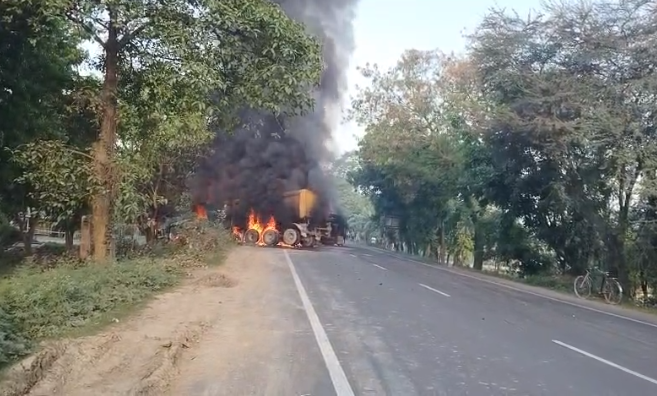 भागलपुर ( BHAGALPUR) : जिले में एक भयावह सड़क हादसे ने इलाके में अफरा-तफरी मचा दी. पुलिस जिला नवगछिया के खरीक थाना क्षेत्र अंतर्गत खरीक चौक के पास ट्रक और मिनी ट्रक के बीच आमने-सामने की जोरदार टक्कर हो गई. टक्कर इतनी भीषण थी कि दोनों वाहनों में तुरंत आग लग गई और देखते ही देखते आग ने विकराल रूप धारण कर लिया. आग की लपटें इतनी तेज थी कि काफी देर तक उस पर काबू नहीं पाया जा सका जिससे दोनों वाहन पूरी तरह जलकर राख हो गए.