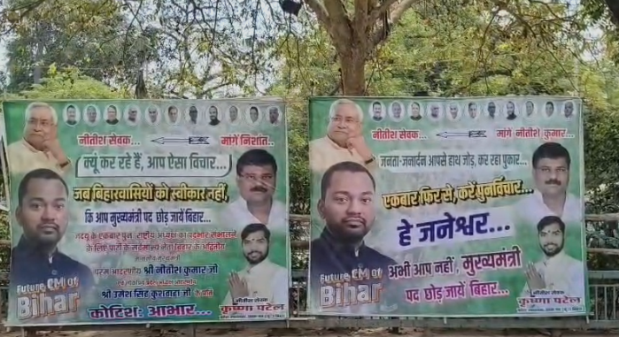 यह पोस्टर छात्र जदयू के उपाध्यक्ष की ओर से लगाया गया बताया जा रहा है. पोस्टर में लिखा गया है “क्लाइमेट लीडर के संकल्पों को पूरा करने के लिए तैयार है भाई निशांत” साथ ही एक और लाइन ने खास ध्यान खींचा. “नीतीश सेवक मांगे निशांत, अब नए चेहरे पर क्यों करें विचार”.