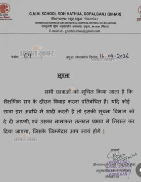 यदि कोई छात्रा जीएनएम कोर्स के दौरान शादी करती है, तो उसका नामांकन तुरंत रद्द कर दिया जाएगा. यह नियम अनुमंडलीय अस्पताल हथुआ परिसर में संचालित नर्सिंग संस्थान की सभी छात्राओं पर लागू है. संस्थान की प्राचार्या मानसी सिंह ने स्पष्ट किया कि यह नियम किसी व्यक्तिगत निर्णय का परिणाम नहीं है, बल्कि विभागीय दिशा-निर्देशों के तहत लागू किया गया है. उन्होंने बताया कि एडमिशन के समय ही छात्राओं से एक लिखित घोषणा पत्र लिया जाता है, जिसमें यह शर्त शामिल होती है कि वे तीन साल की पढ़ाई पूरी होने तक शादी नहीं करेंगी.