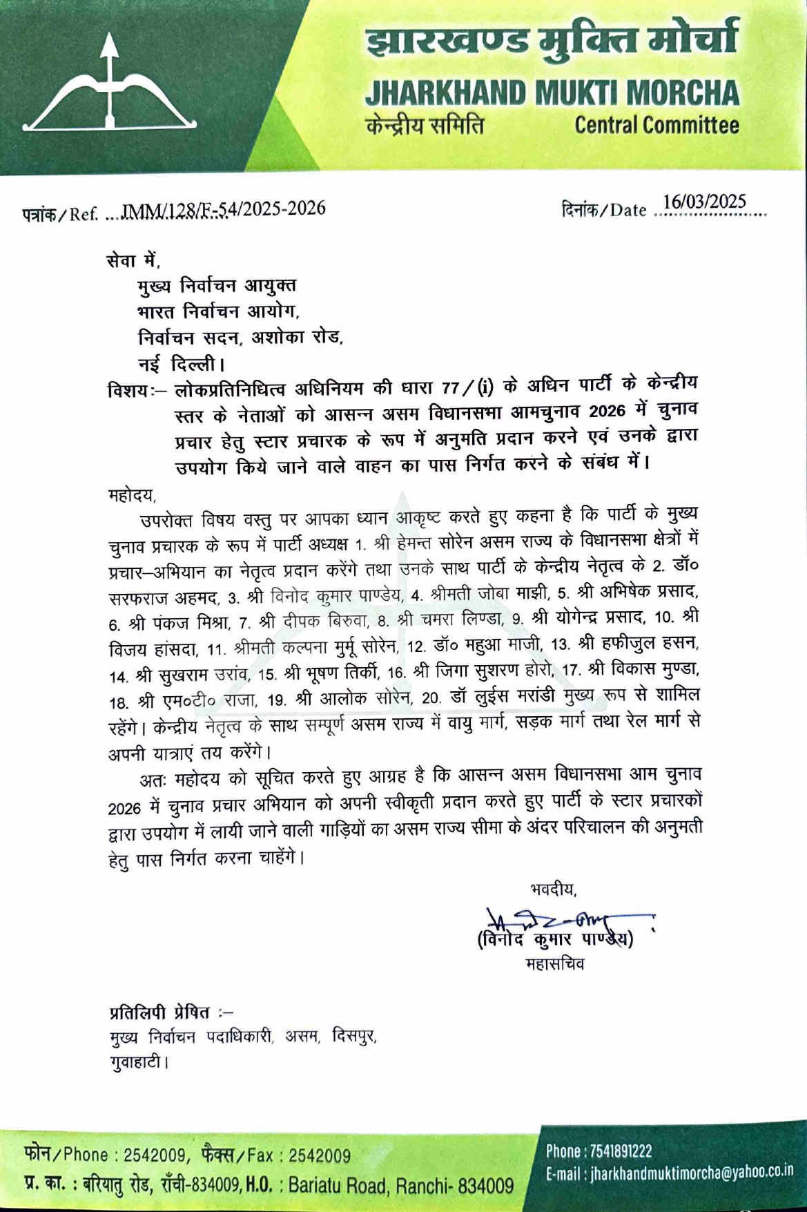 असम चुनाव के घोषणा के साथ ही झारखंड मुक्ति मोर्चा ने अपने स्टार प्रचारकों की लिस्ट जारी कर दी है. 20 स्टार प्रचारक के साथ झामुमो चुनावी दंगल में कूदेगी. जिसमें मुख्यमंत्री हेमंत सोरेन के साथ कल्पना सोरेन शामिल है.झामुमो ने इसकी जानकारी भारत निर्वाचन आयोग को दी है. जिसमें सभी के नाम का जिक्र किया गया है.