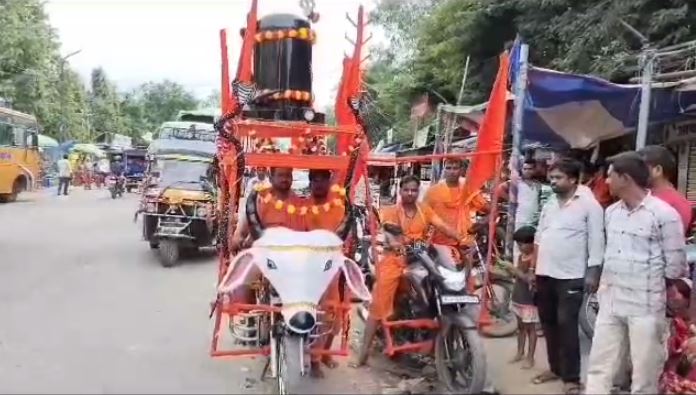 गढ़वा के रहने वाले सत्येंद्र कुमार कांवर लेकर बाबा धाम जा रहे हैं. उन्होंने अपनी बाइक को कुछ इस तरह तैयार किया है जैसे वह भोले बाबा के सवारी नंदी हों. बाइक के ऊपर चदरा से शिवलिंग का रूप बनाया गया है. सत्येंद्र कुमार अपने अन्य साथी के साथ बाबा धाम के लिए निकले हैं. उनके साथ कुल 8 लोग हैं एक बाइक को इस तरह से तैयार किया गया है. इसे तैयार करने में लगभग सात- आठ दिन लगे हैं. लोगों के बीच यह नंदी रूपी बाइक कांवर चर्चा का विषय बना हुआ है.लोग इसके साथ सेल्फी भी ले रहे हैं.