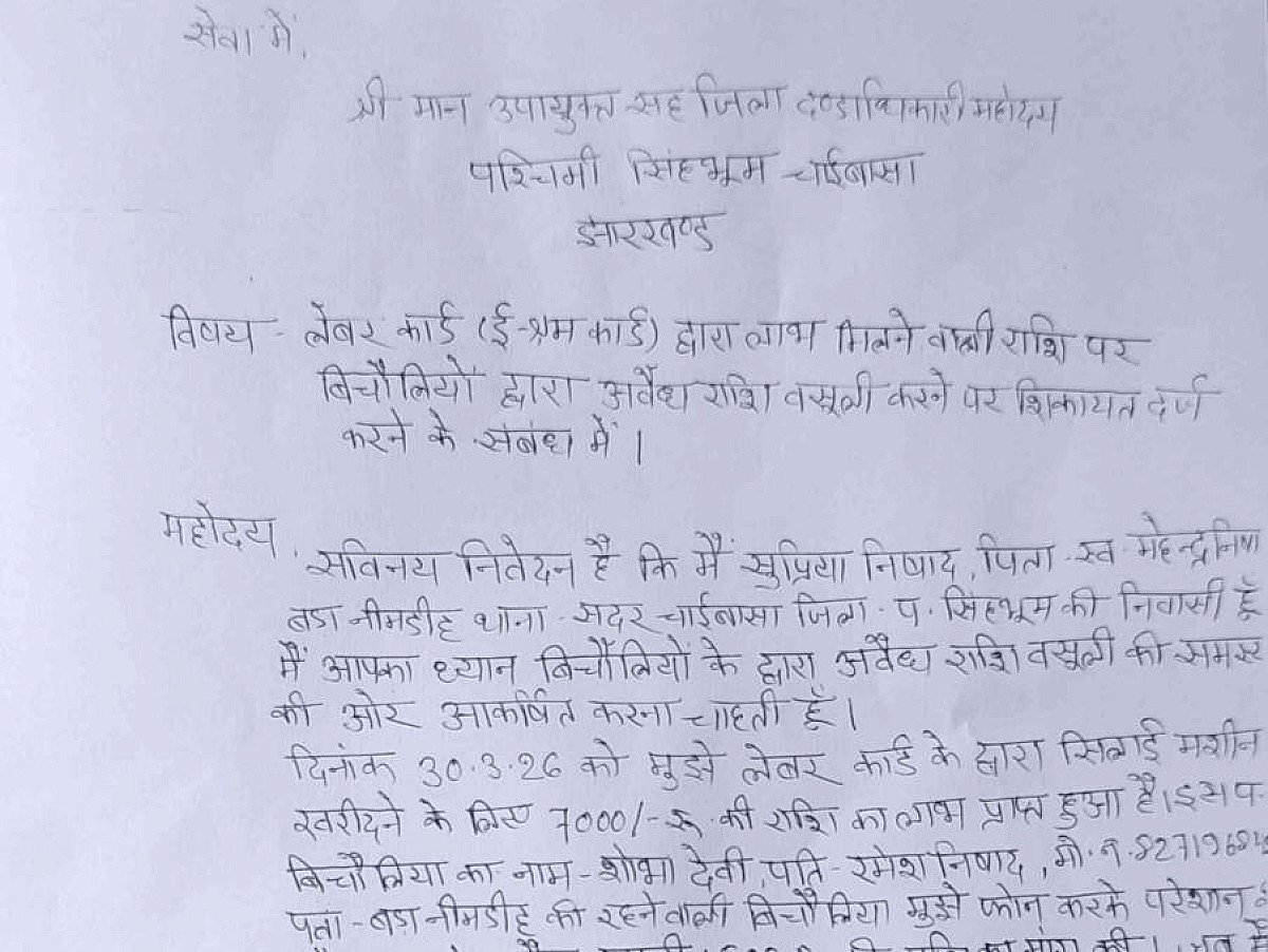 आपको बताये कि पश्चिमी सिंहभूम जिले में लेबर कार्ड (ई-श्रम कार्ड) बनाकर लाभ दिलाने की शिकायत आया सामने,पीड़िता सुप्रिया निषाद ने शोभा देवी व अन्य बिचौलियों के द्वारा अवैधd राशि वसूली करने की शिकायत जिला समाहरणालय स्थित उपायुक्त चंदन कुमार से की है. पत्र में कहा है कि दिनांक 30 मार्च को मुझे लेबर कार्ड के द्वारा सिलाई मशीन खरीदने के लिए 7000 रुपये की राशि का लाभ प्राप्त हुआ है. इस पर बिचौलिया शोभा देवी ने मुझे फोन करके परेशान कर रही है और मुझे से अवैध वसूली 1500 रु. की रात्रि का मांग की.जब में पैसे देने से इनकार की तो उसने मुझे अधिकारियों द्वारा मेरा लेबर कार्ड बंद करवा देने की धमकी भी दी.
