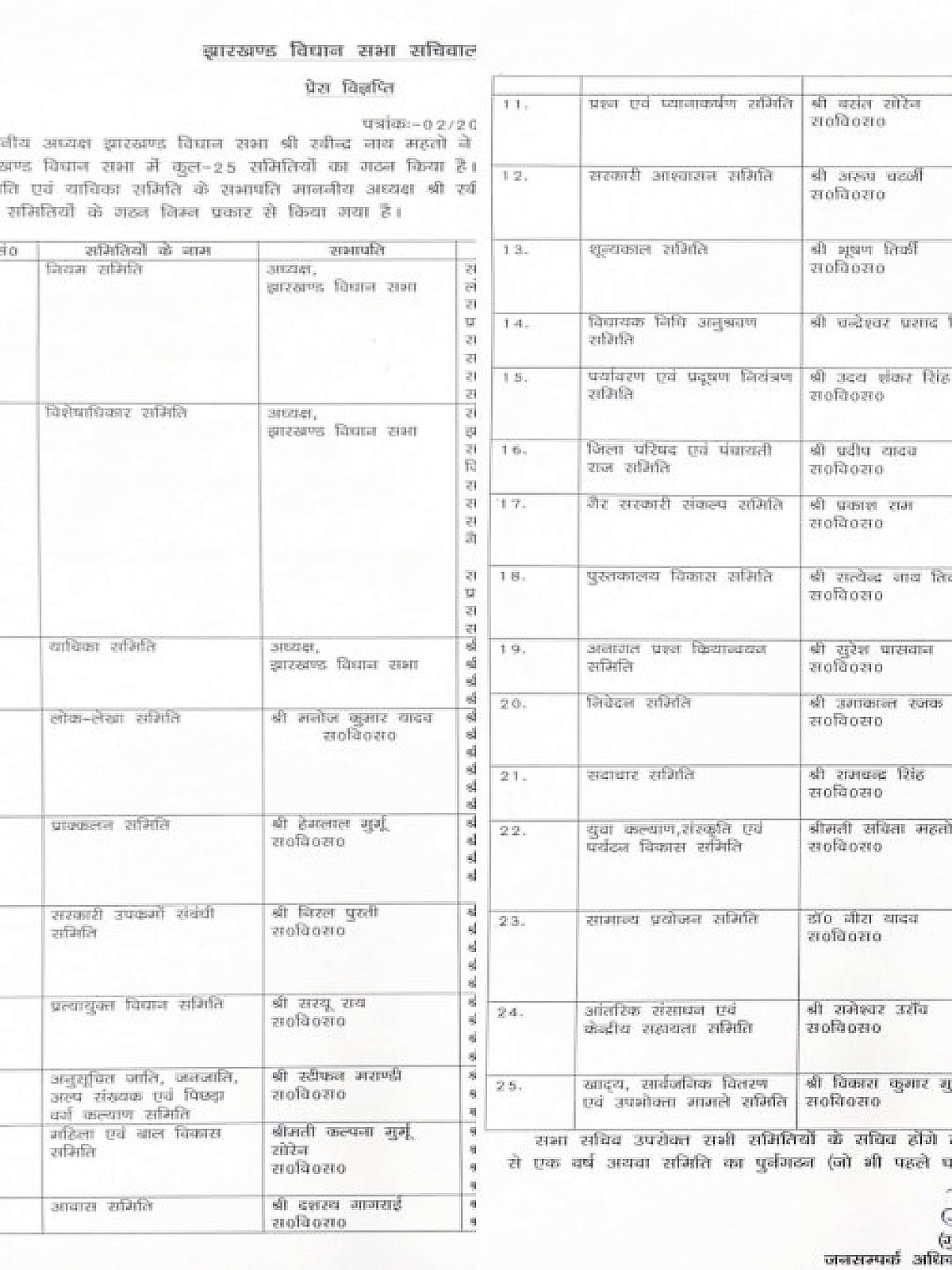 गठित समितियों में लोक लेखा समिति की जिम्मेदारी मनोज कुमार यादव को सौंपी गई है, जबकि प्राक्कलन समिति की अध्यक्षता हेमलाल मुर्मू करेंगे. सरकारी उपक्रमों संबंधी समिति के सभापति निरल पुर्ती बनाए गए हैं. इसके अलावा महिला एवं बाल विकास समिति की जिम्मेदारी कल्पना मुर्मू सोरेन को दी गई है, जबकि प्रश्न एवं ध्यानाकर्षण समिति का नेतृत्व बसंत सोरेन करेंगे.