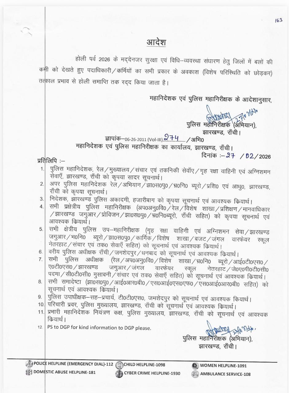 बड़ी खबर : अलर्ट पर झारखंड पुलिस, होली पर पुलिसकर्मियों की छुट्टियां रद्द