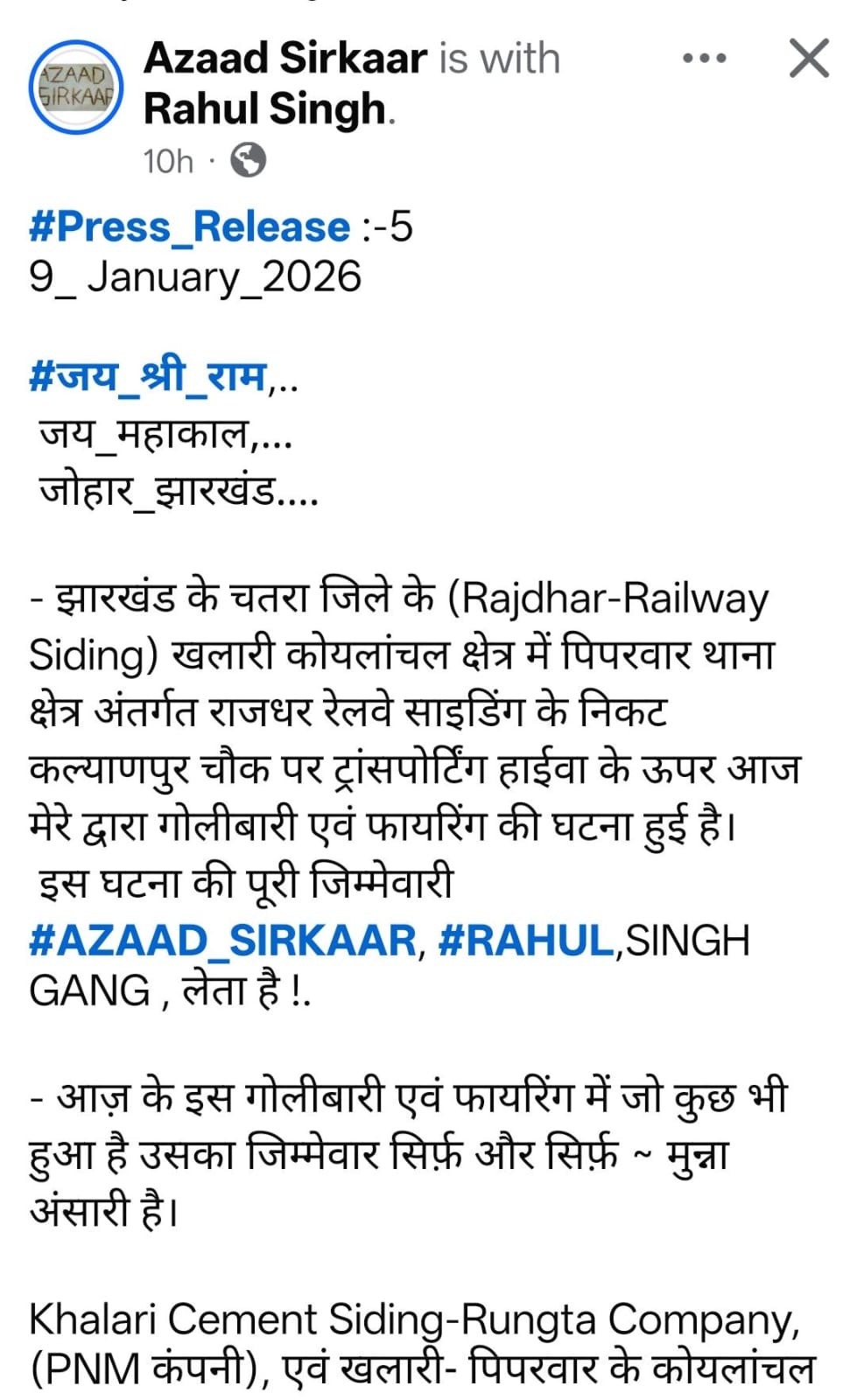 प्रेस नोट में गिरोह ने पिपरवार कोयलांचल क्षेत्र की विभिन्न रेलवे साइडिंग पर काम करने वाले लोगों को चेतावनी भी दी है. संदेश में कहा गया है कि यह कार्रवाई केवल चेतावनी के तौर पर की गई है और पहले की तरह ‘मैनेज’ कर काम करने की बात दोहराई गई है. साथ ही धमकी दी गई है कि अगर ऐसा नहीं हुआ तो अगली बार किसी को भी नहीं छोड़ा जाएगा, चाहे वह कोई भी क्यों न हो.